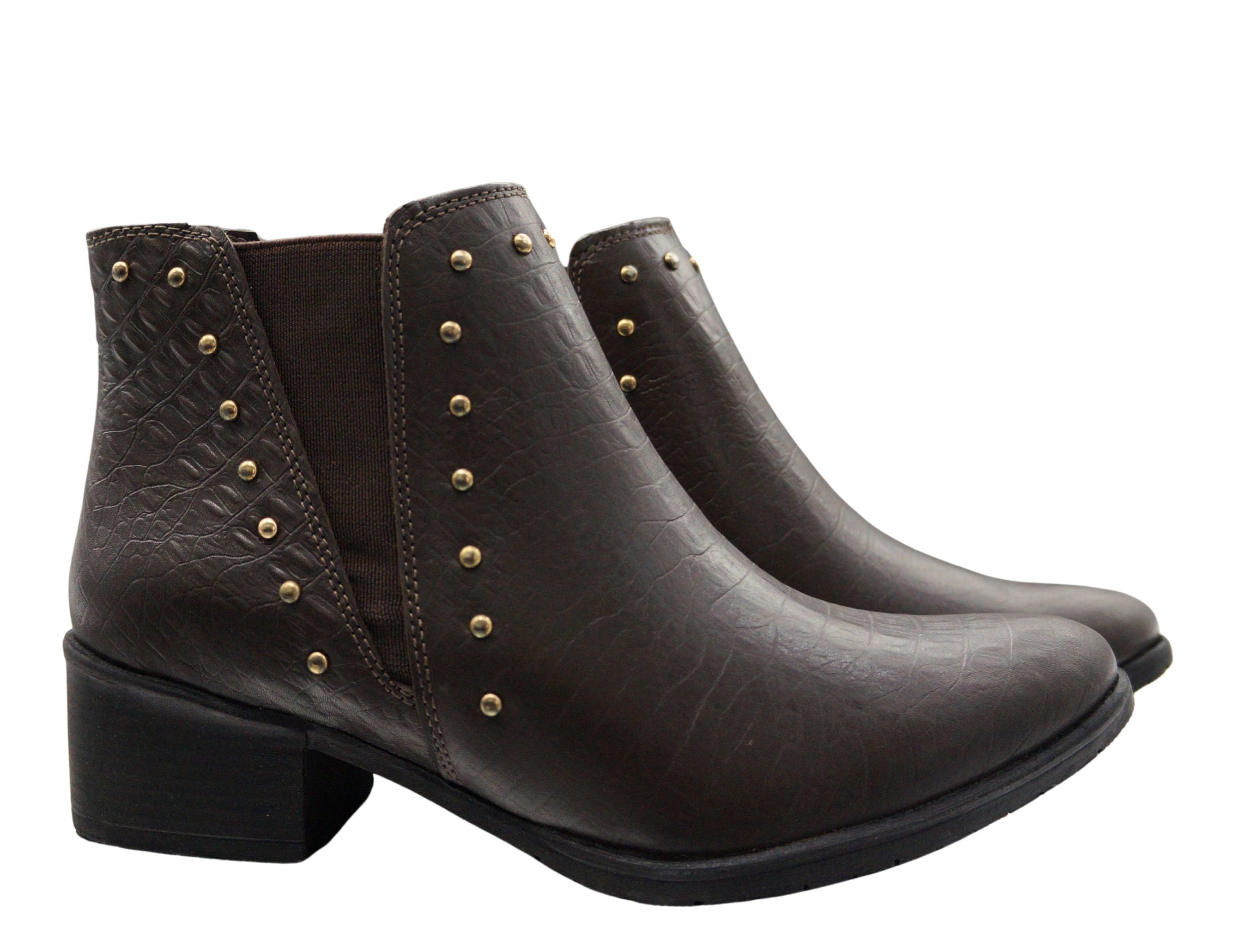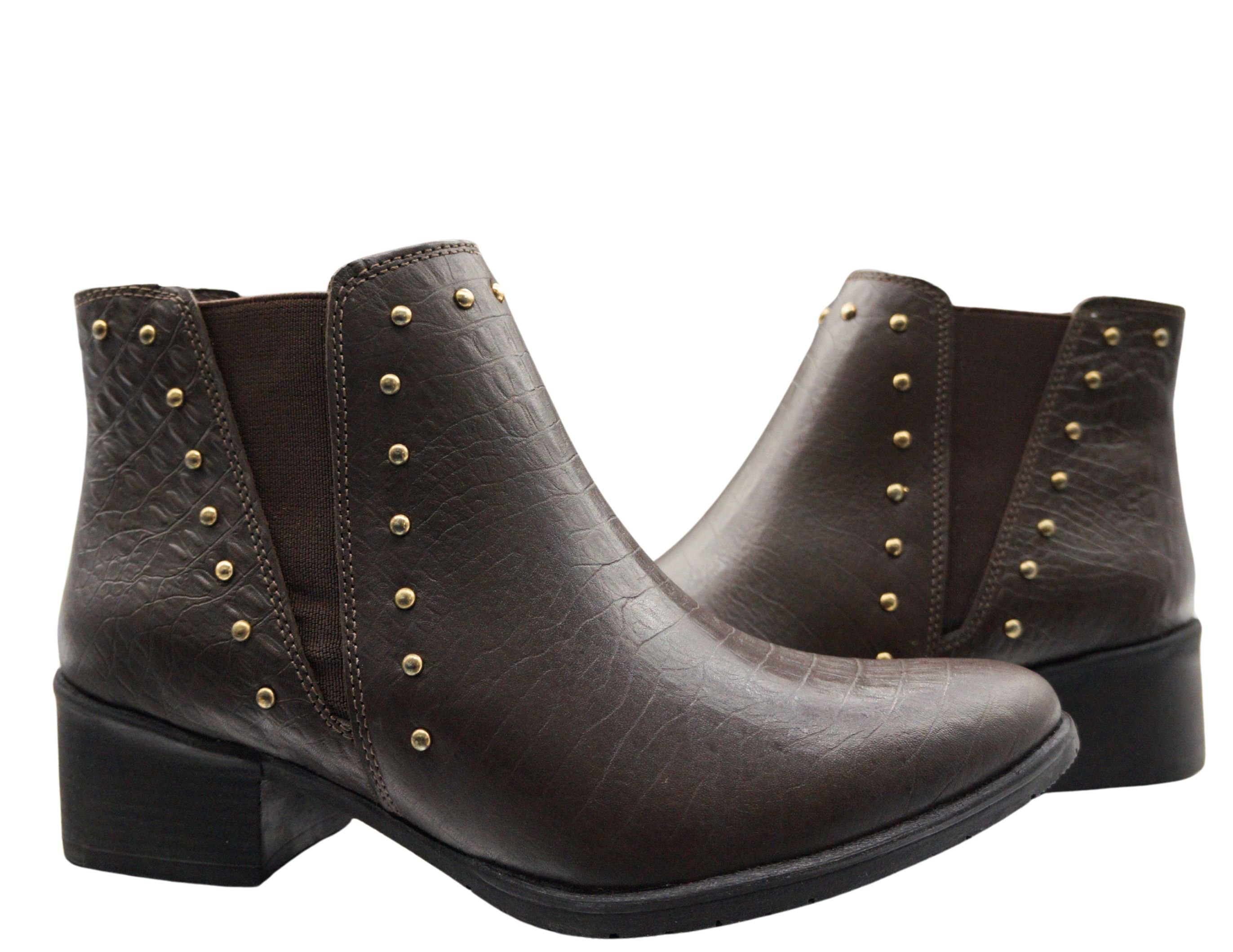 Estilo, conforto e praticidade em um só modelo. Confeccionada em couro legítimo com textura croco na cor café, essa bota é puro charme e personalidade. Possui elástico nas laterais, que facilita o calce e garante ajuste perfeito ao pé. Os detalhes em tachas douradas acrescentam um toque moderno e elegante, enquanto o salto médio oferece conforto e estabilidade para o uso diário. O bico levemente fino completa o visual sofisticado e versátil, ideal para compor produções casuais ou mais arrumadas.